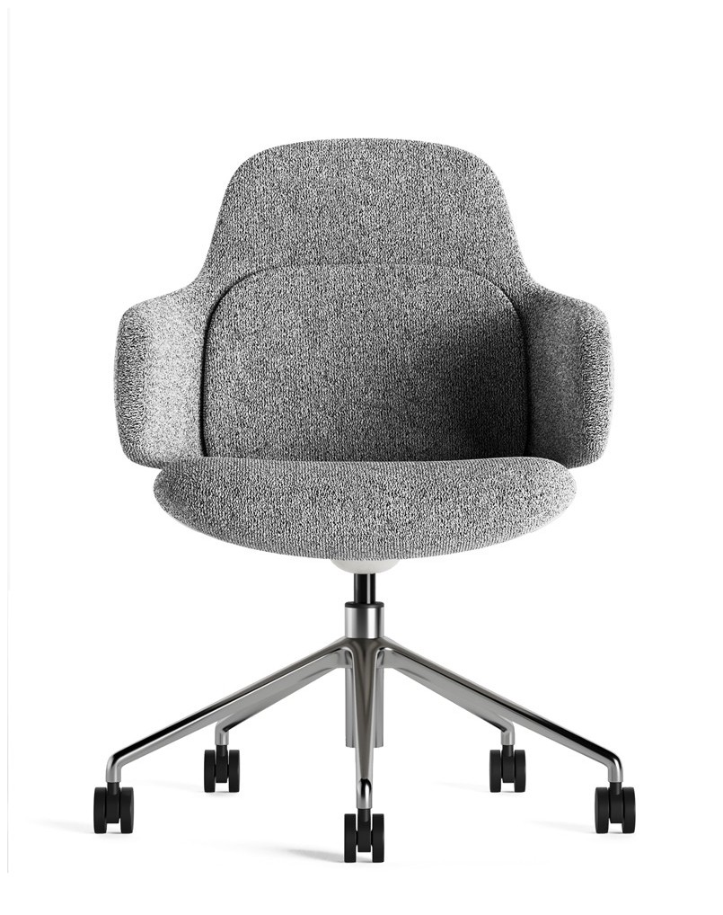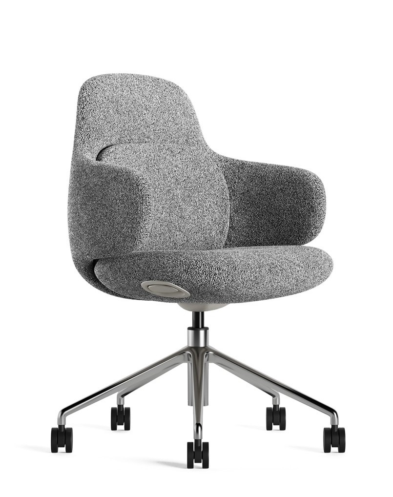 Minimalist multi-purpose chair for modern workspaces with soft padding for comfort. Features smooth hydraulic height adjustment supports proper posture, with a tilting lock, easy control button, and polished aluminum base.
