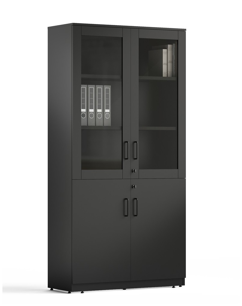 A two-sectioned glass door cabinet with enclosed shelves located on the upper segment and an enclosed wooden door cabinet located on the lower area. It also has locking mechanism to secure the files.