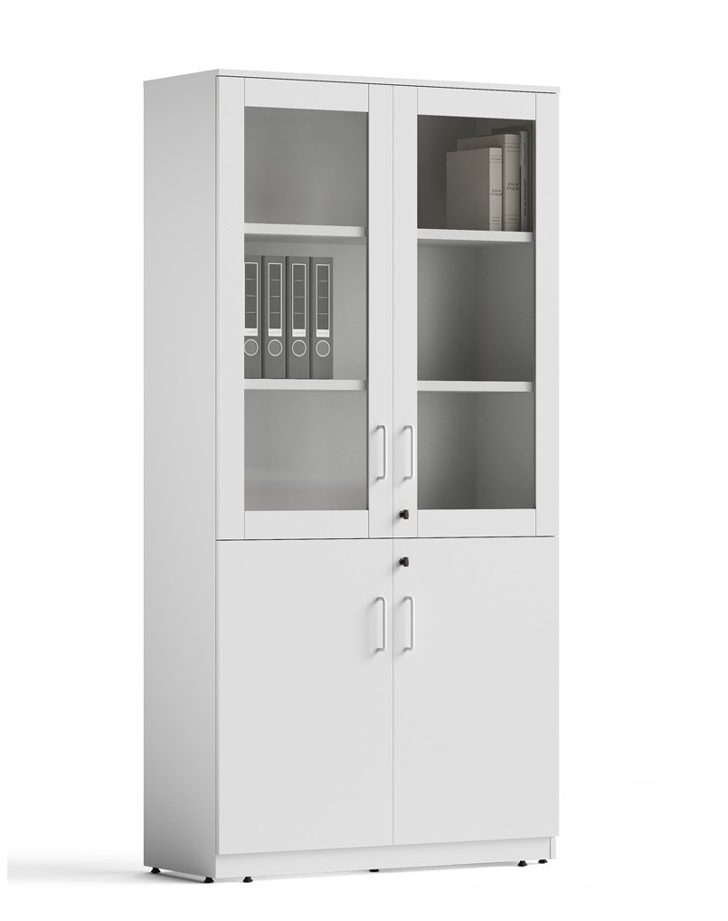 A two-sectioned glass door cabinet with enclosed shelves located on the upper segment and an enclosed wooden door cabinet located on the lower area. It also has locking mechanism to secure the files.