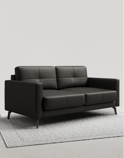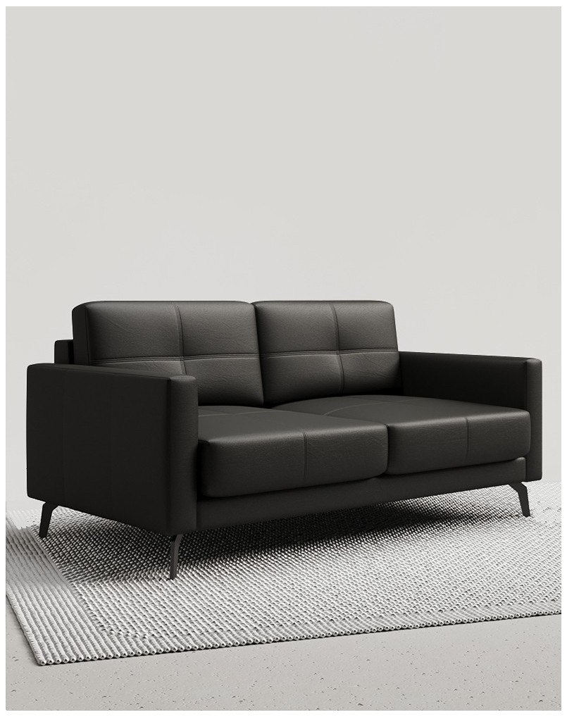 Elegant Genuine Leather sofa with steel black base. The lounge sofa has sleek angular black legs, squared cushioned armrest, and it also has linear stitching along the seats, arms, and back defining the details of the sofa.