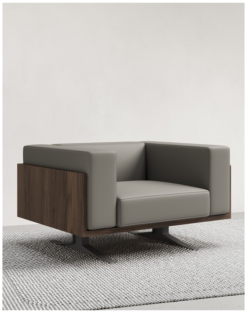 Sleek and elegant lounge chair featuring an architectural frame with genuine leather seats. Designed with wide black steel legs and a 3 cm thick oak veneer structure, upholstered in premium leather with refined linear stitching along the seat, arms, and backrest for added detail and sophistication.