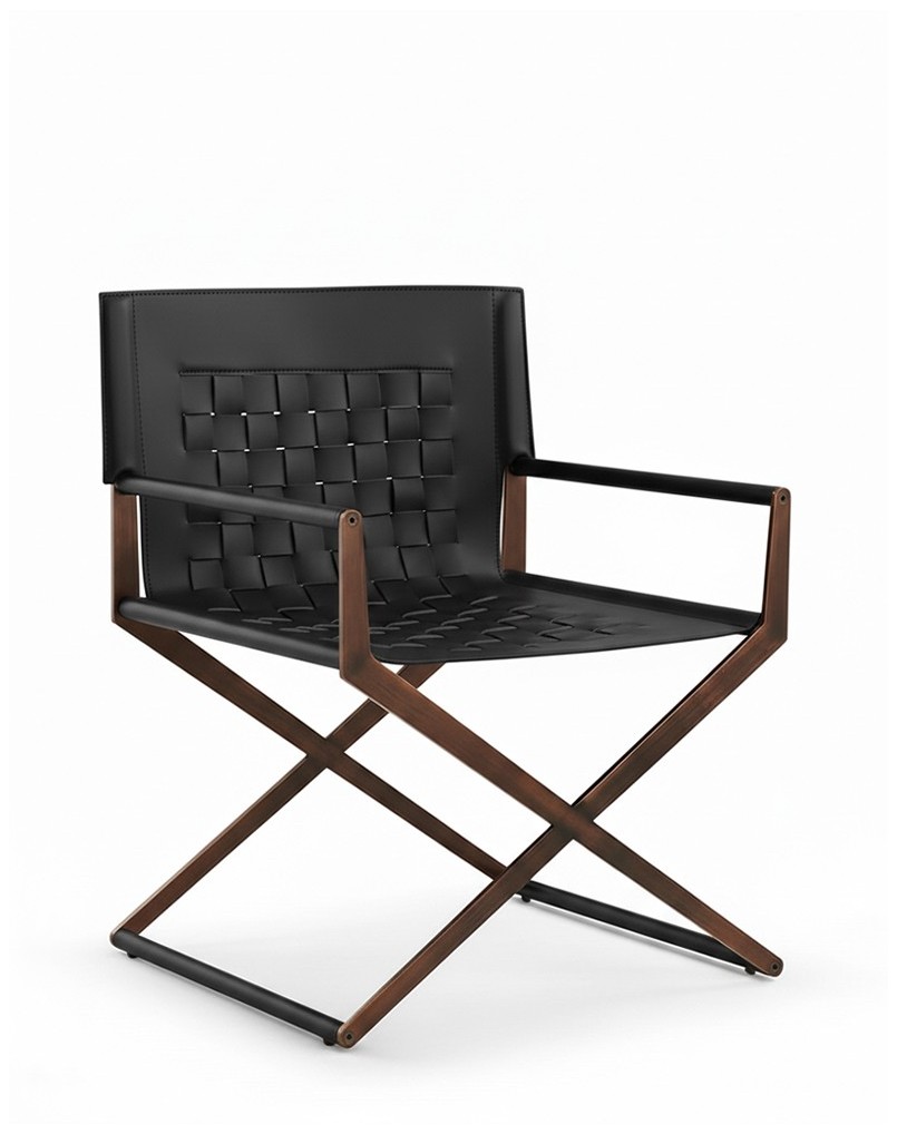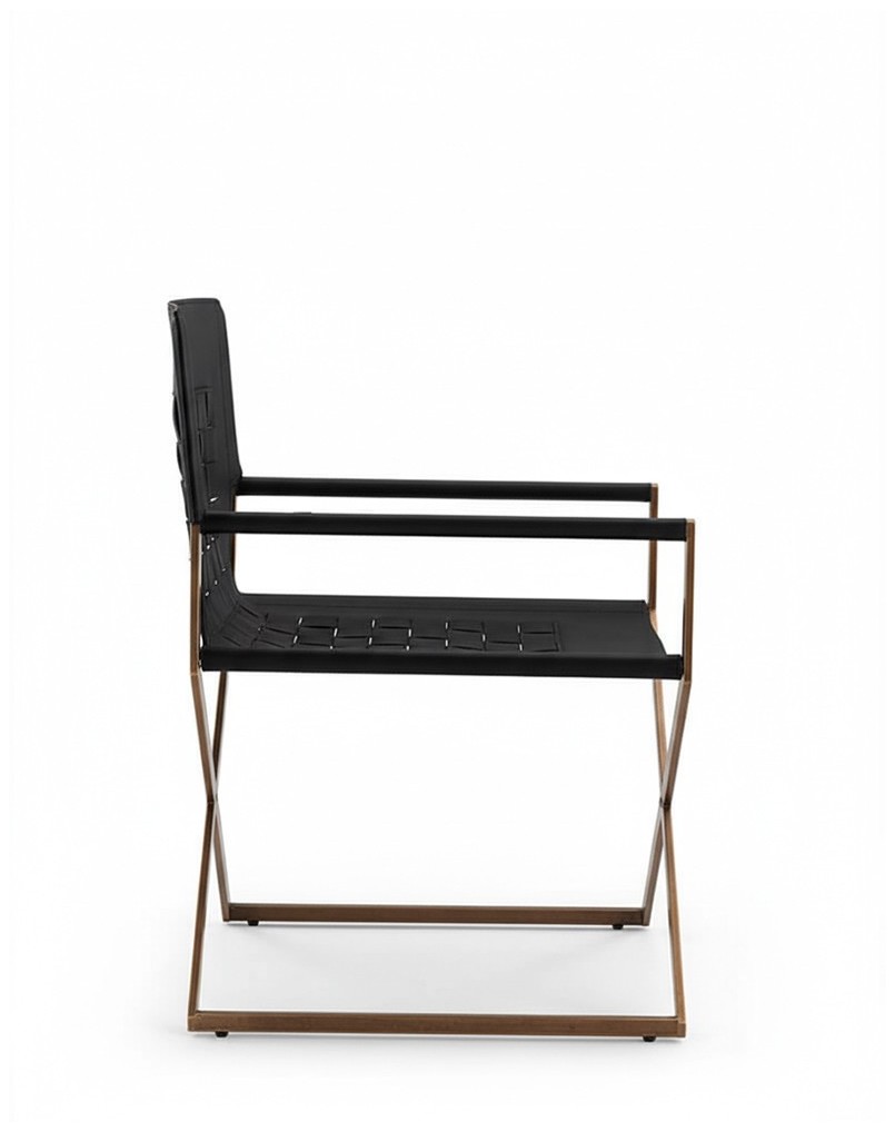 The Martin Director Chair featuring an X-shaped frame in an elegant bronze finish. The seat and back are crafted from premium genuine leather with an exquisite woven design detail. A sophisticated choice for executive offices or high-end living spaces.